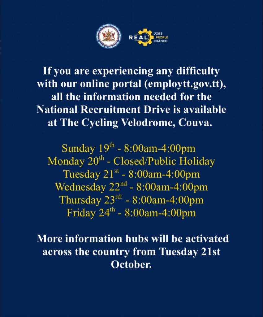 If you are experiencing any difficulty with our online portal (https://employtt.gov.tt/jobsrecruitmentdrive), all the information needed for the National Recruitment Drive is available at The Cycling Velodrome, Couva.